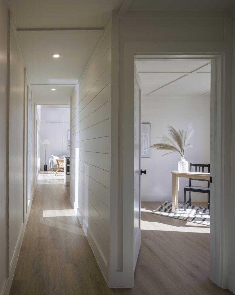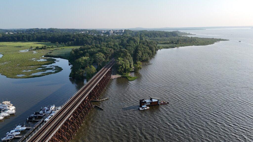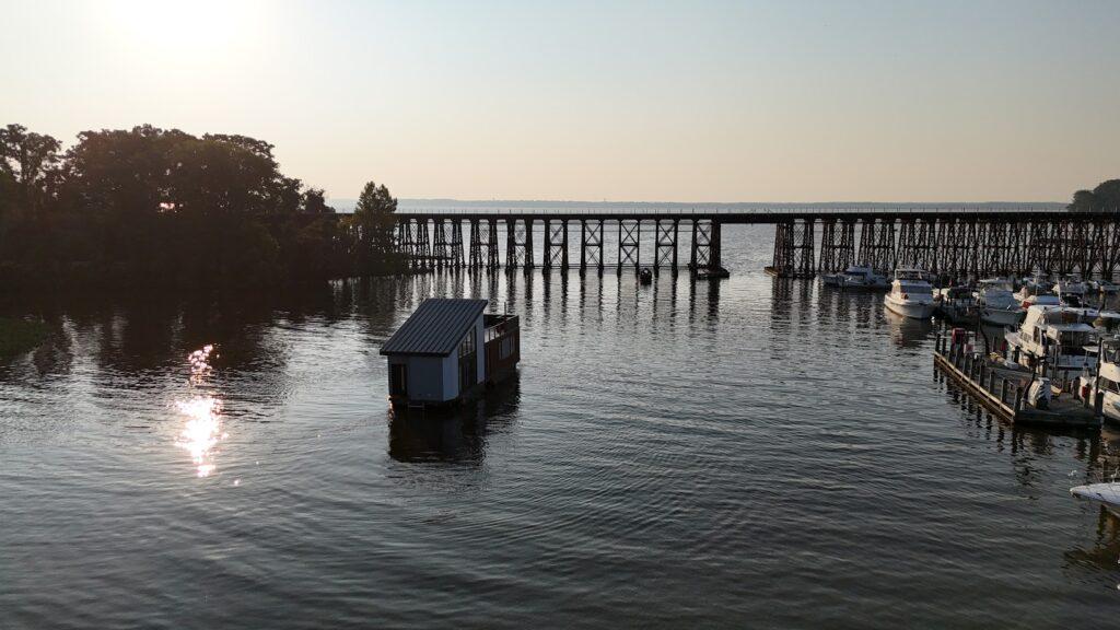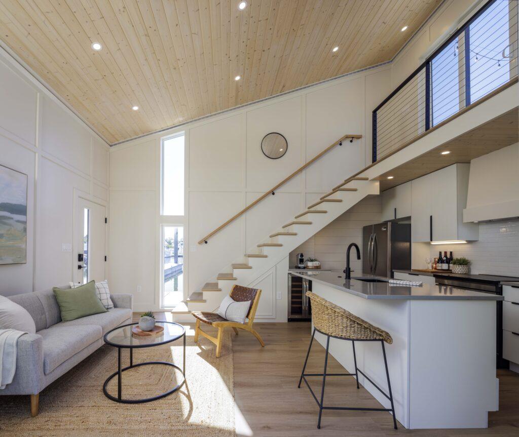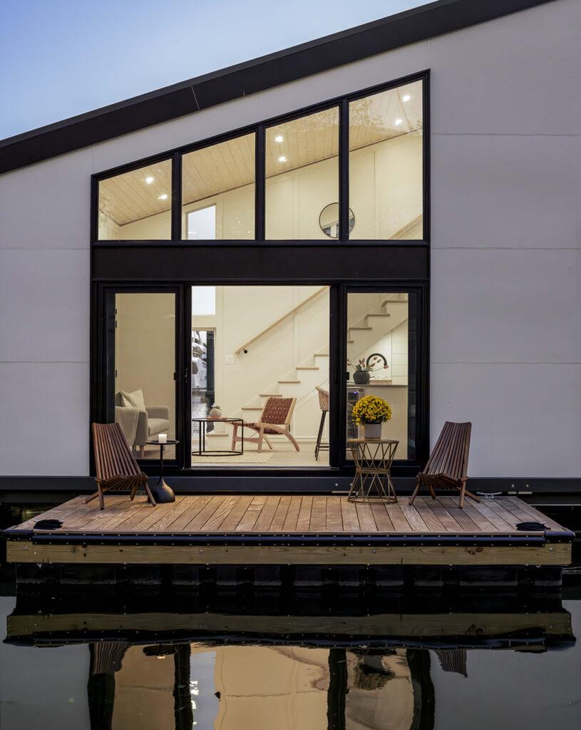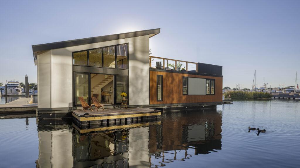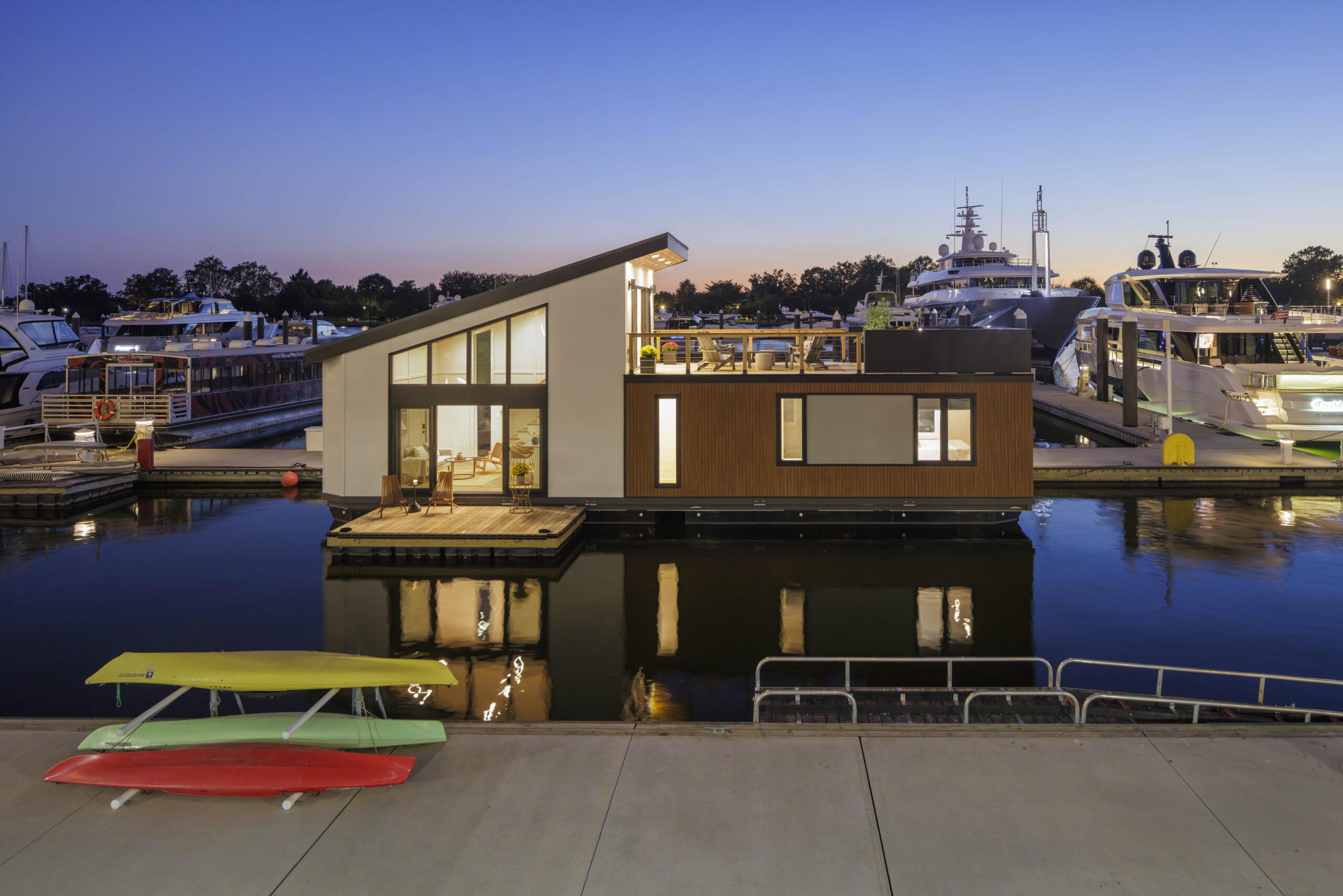 This new floating home was fabricated off site and floated to its final destination at the DC Wharf. The main floor provides 800sf of living space including two bedrooms, two full baths, kitchen and living/dining rooms with large sliding doors from the living room and primary bedroom to a floating deck for added outdoor space. Interior stairs lead to a roof deck with sweeping views of the marina, the Washington Channel, Haines Point and the Wharf. Photography by Paul Warchol